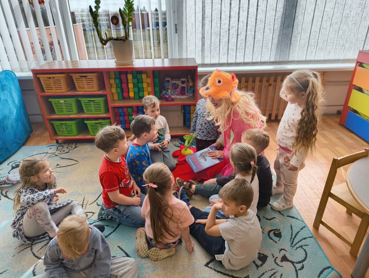 Rytmetys su knyga „Voveriukų“ grupėje buvo kupinas jaukumo, smalsumo ir šilto bendravimo. Kovo 26 d. grupėje tvyrojo rami, tačiau kartu ir džiugi nuotaika – vaikai nekantriai laukė ypatingos viešnios. Svečiuose apsilankė Godos ir Jokūbo mama, kuri atėjo ne tik su knyga, bet ir su gera nuotaika – ji buvo pasipuošusi tarsi gėlytė, todėl iškart sukūrė šventišką atmosferą ir prikaustė vaikų dėmesį. Vaikai susėdo ratu ant minkšto kilimo, pasiruošę leistis į pasakų pasaulį, o mama pradėjo skaityti knygą „Melagių pasakos“.