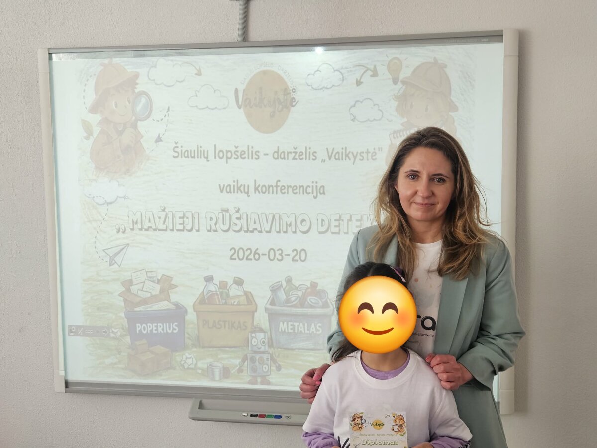 2026 m. kovo 20 d. 10.00 val. Šiaulių lopšelio-darželio „Voveraitė“ priešmokyklinio ugdymo grupės „Smalsučiai“ ugdytinė Milita M., mokytoja Viktorija T. dalyvavo Šiaulių lopšelio-darželio „Vaikystė“ organizuojamoje vaikų konferencijoje „Mažieji rūšiavimo detektyvai“, skirtoje Žemės dienai paminėti. Vaikų konferencijos tikslas – plėtoti ikimokyklinio ir priešmokyklinio amžiaus vaikų aplinkosauginį sąmoningumą, formuojant teigiamą požiūrį į atliekų rūšiavimą ir atsakingą vartojimą.