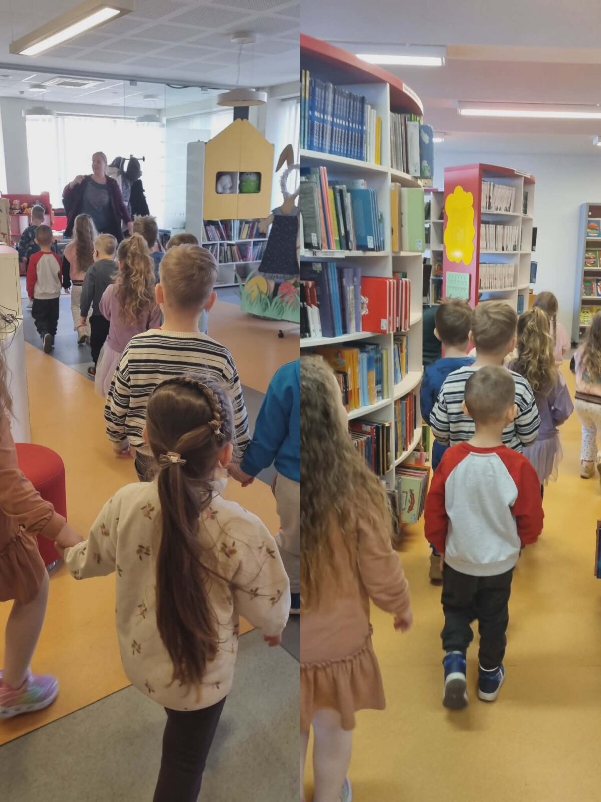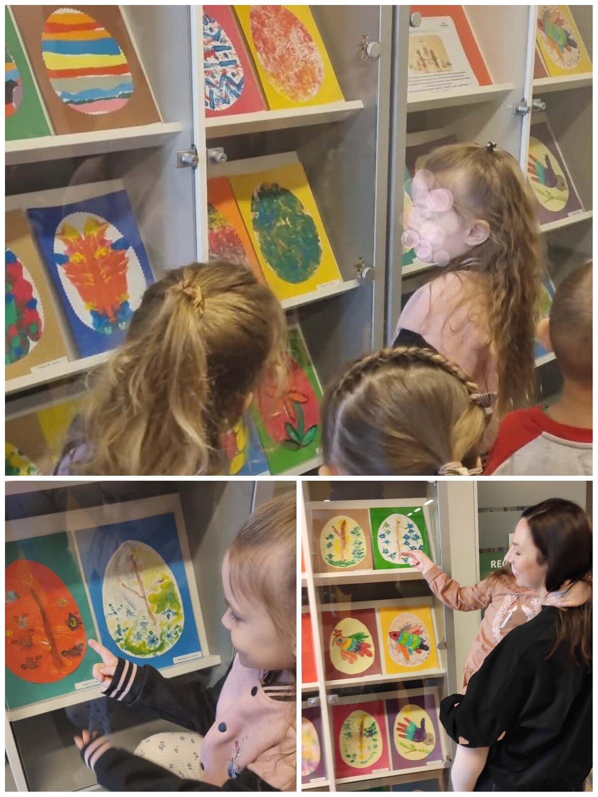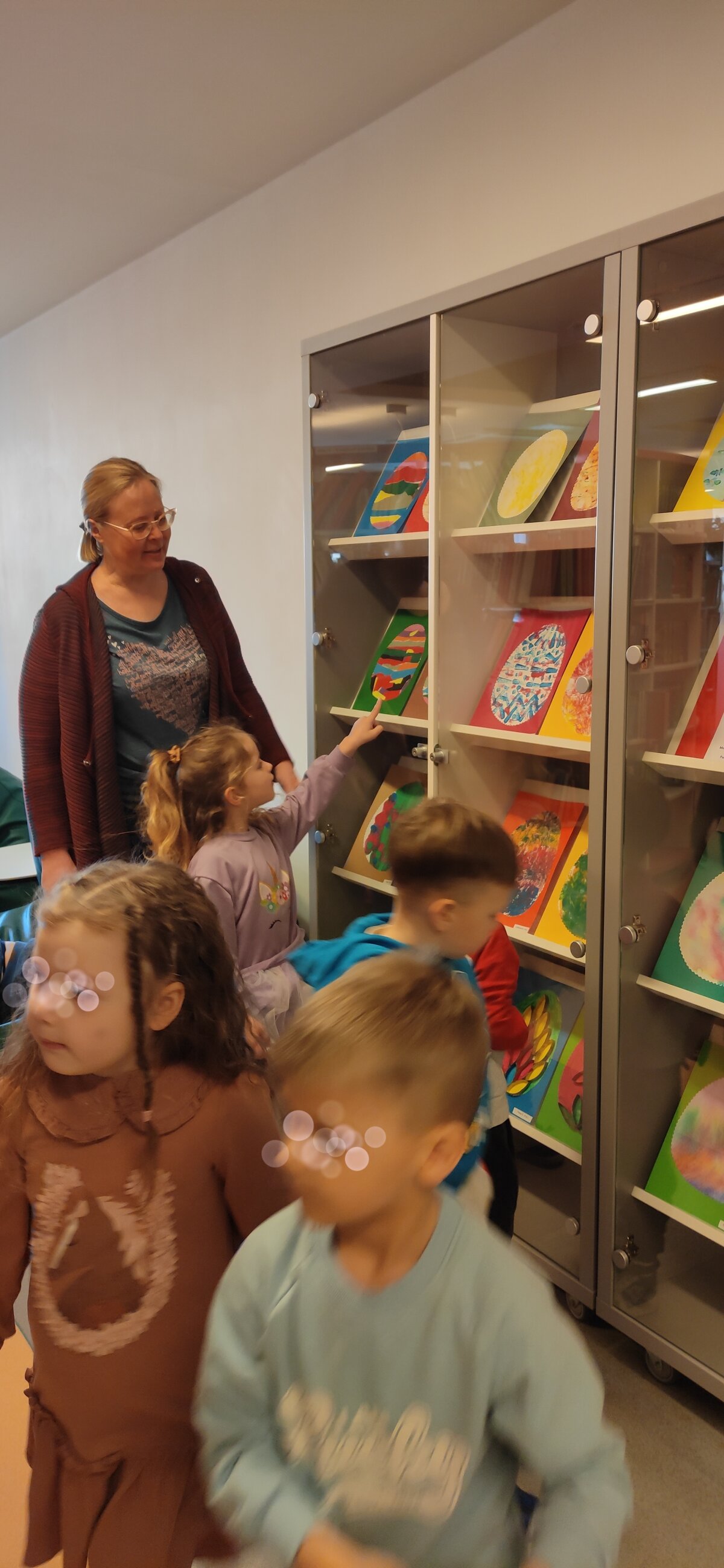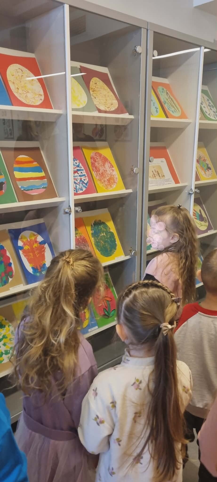 Prieš išvykdami už darželio teritorijos, vaikai išklausė saugaus elgesio gatvėje instruktažą, o bibliotekoje tarp knygų lentynų smalsiai ieškojo savo darbelių – tarsi mažų kūrybos lobių. Vaikai atpažino savo darbus, džiaugėsi galimybe juos pamatyti viešoje erdvėje ir pasidalinti įspūdžiais. Tai sustiprino jų pasitikėjimą savo kūryba ir suteikė naujų patirčių. Vaikų abonemento darbuotoja Vaida supažindino vaikus ir su paroda „Zuikių Velykos“, kurioje pristatyti kitų vaikų kūrybiniai darbai.