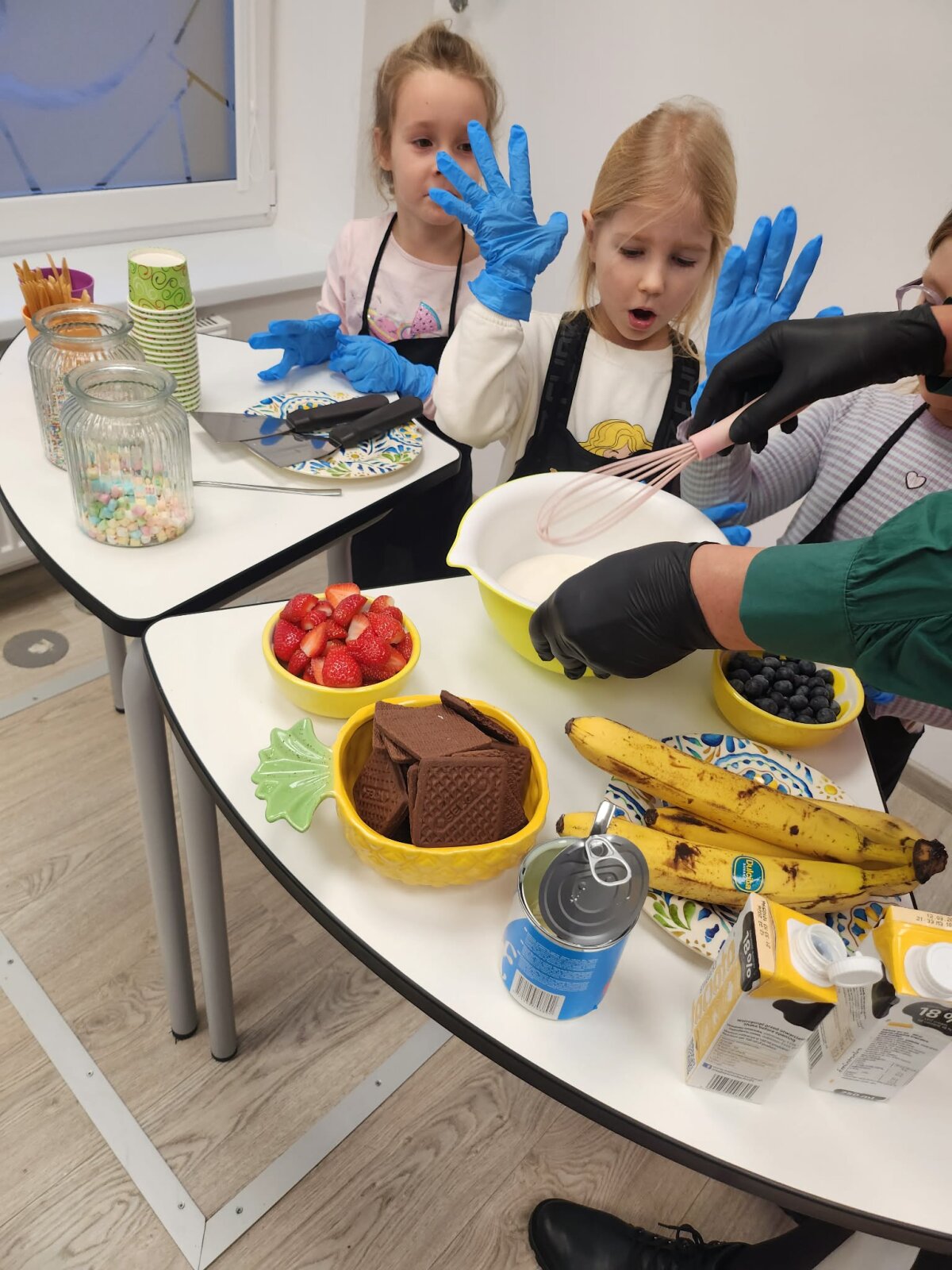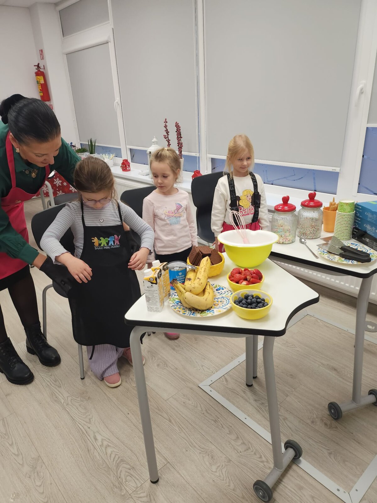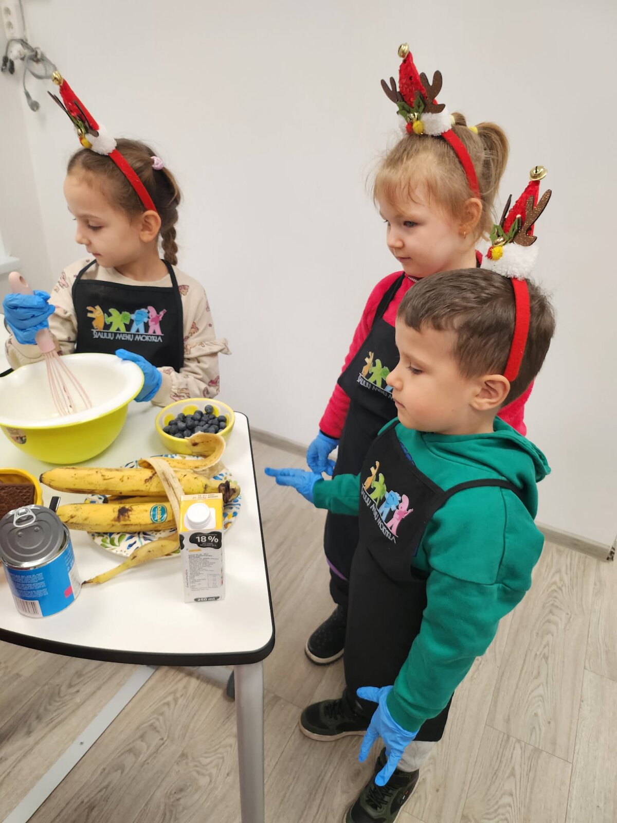 Praktinėje veiklos dalyje vaikai patys tapo mažaisiais ledų kūrėjais. Jie rinkosi ingredientus – braškes, bananus, šilauoges, šokoladinius sausainius, plakė grietinėlę su kondensuotu pienu, mokėsi matuoti, maišyti ir stebėti, kaip keičiasi masės konsistencija. Šis procesas ugdė smulkiąją motoriką, savarankiškumą, atsakomybę ir kantrų, kalėdinio laukimo kupiną darbą.