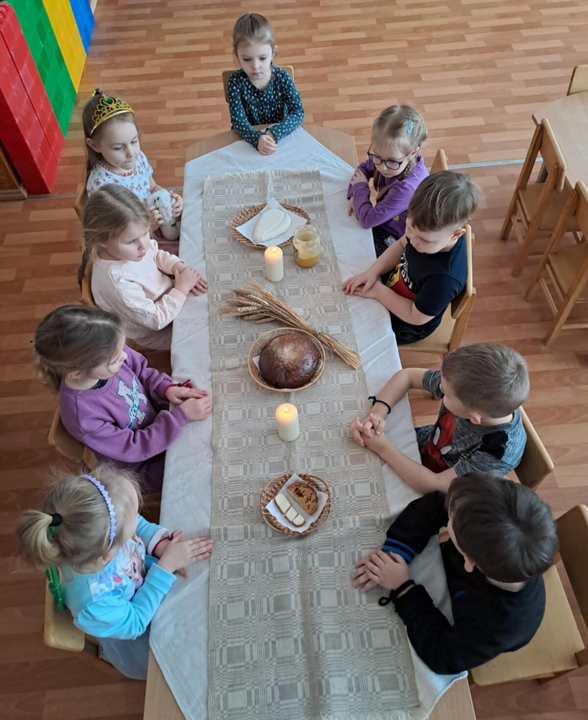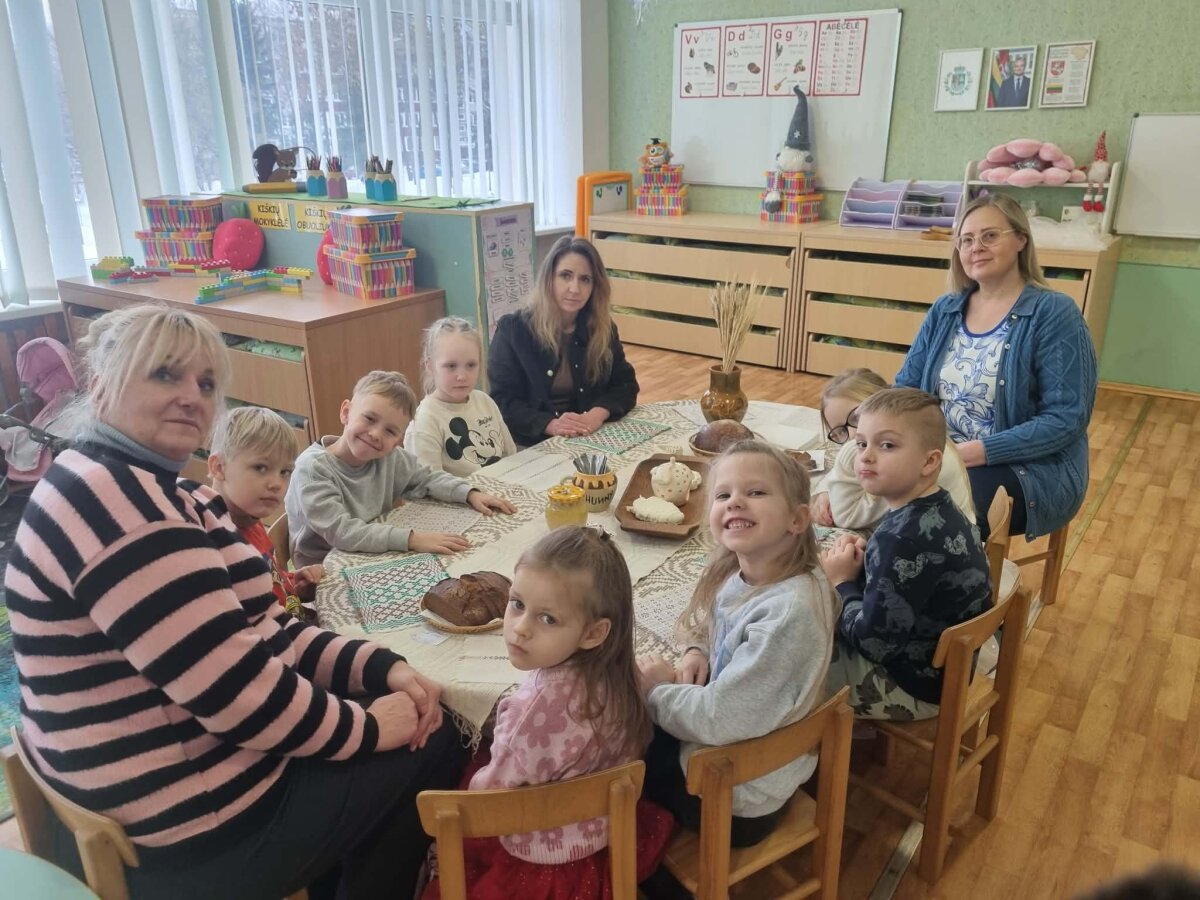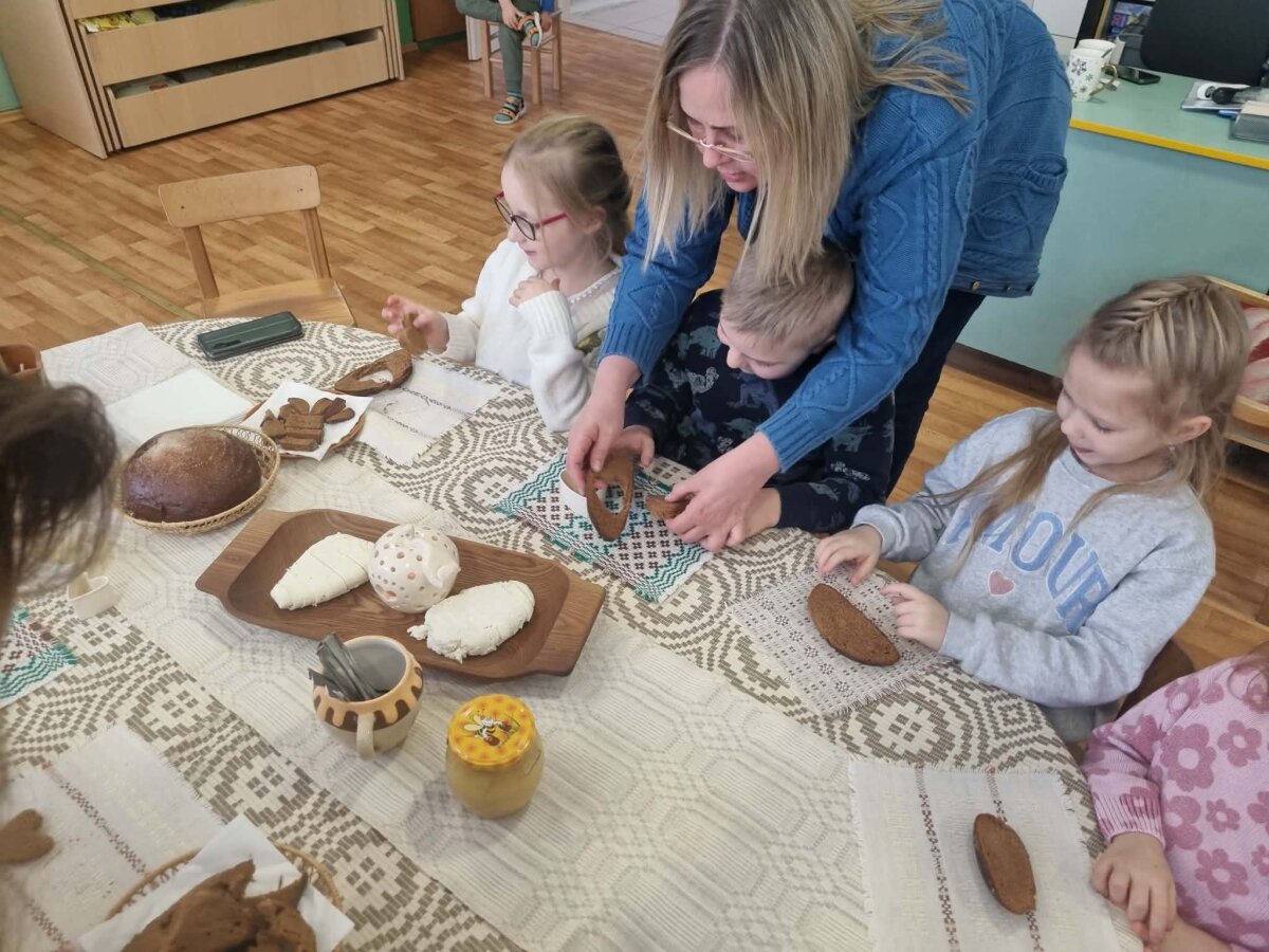 Mokytojos Eglė A., Jūratė K., Marina P., Viktorija T., meninio ugdymo mokytoja Diana P. pasakojo apie lietuviškas tradicijas, senolių papročius ir senovinius maisto gaminimo būdus. Vaikai sužinojo, kuo skiriasi juoda ir balta duona bei kodėl į varškės sūrį dedami kmynai. Taip pat buvo kalbama apie bičių darbą ir medaus kelią nuo avilio iki stalo.