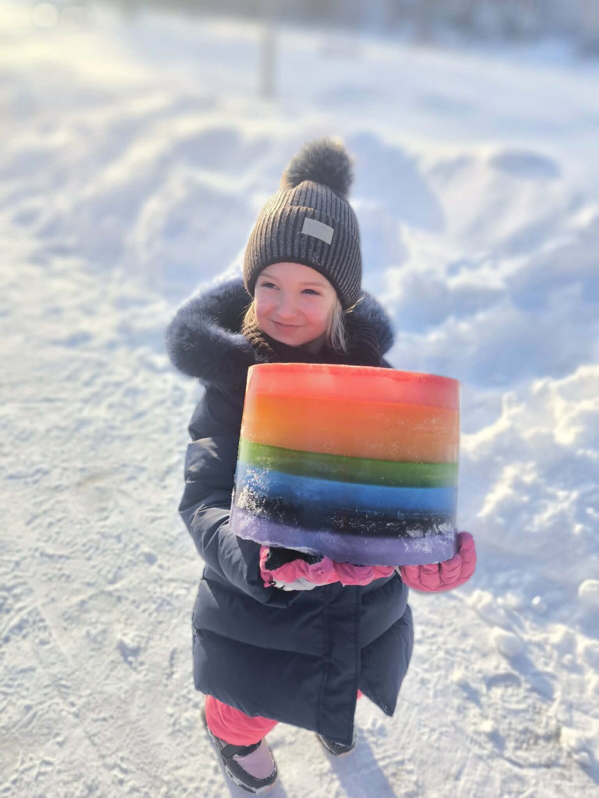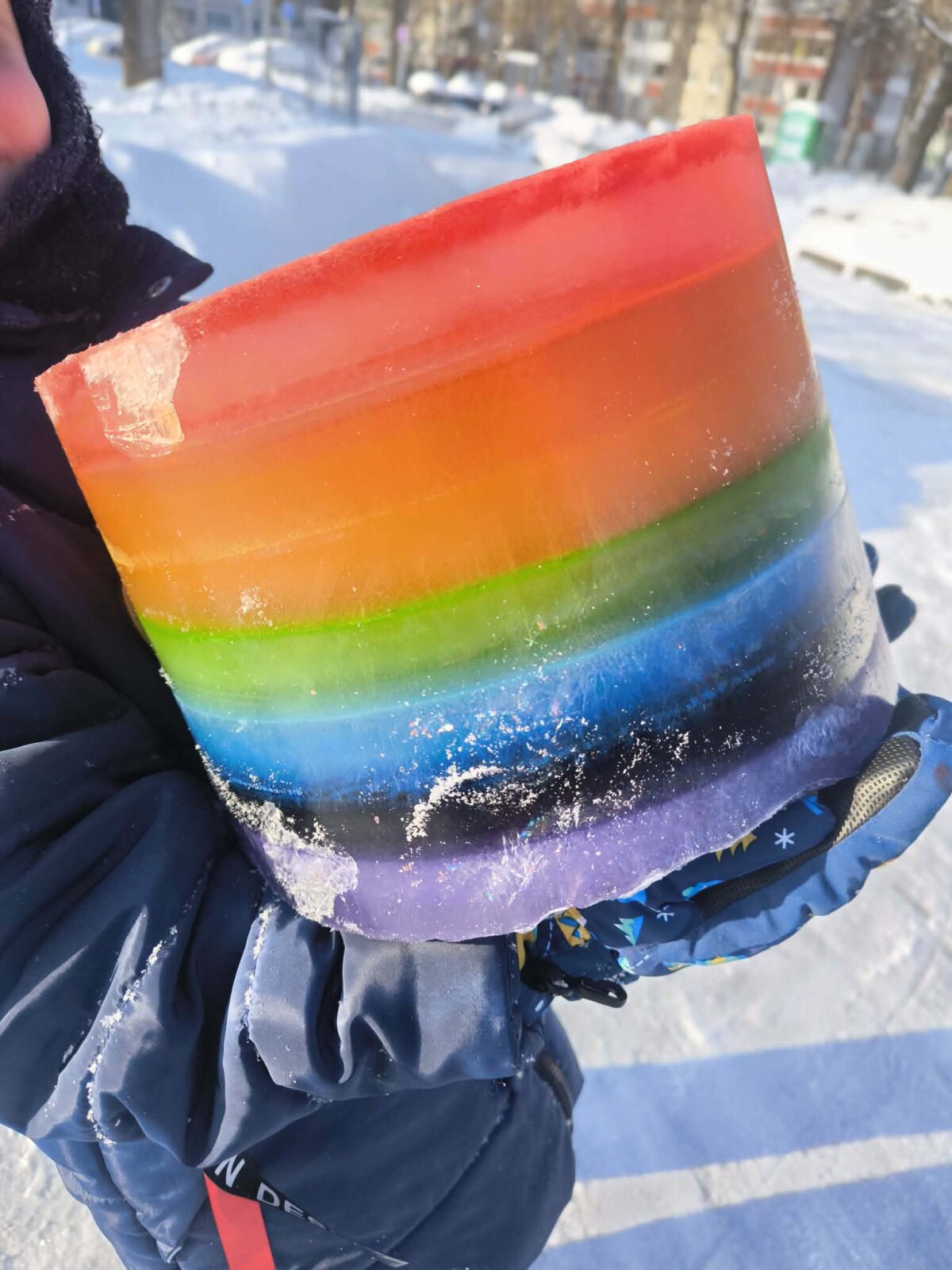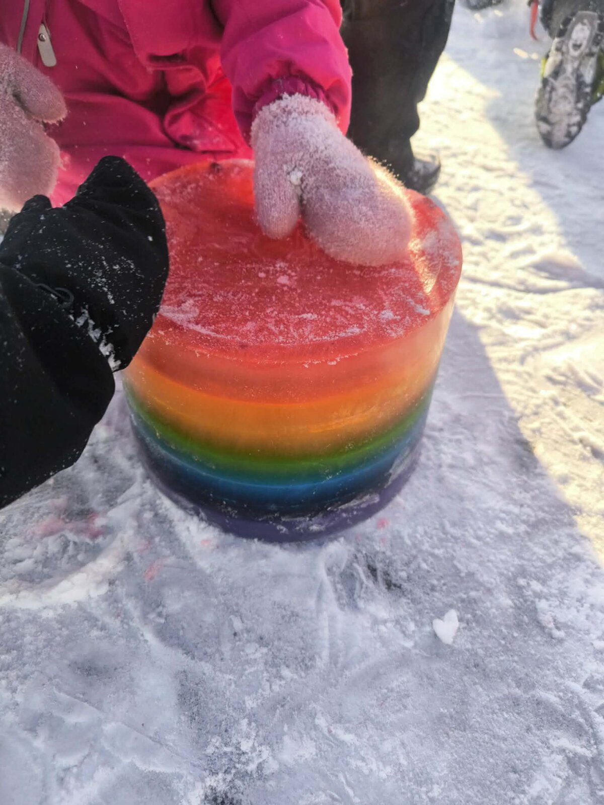 „Pelėdžiukų“ grupės vaikai kartu su mokytoja Reda ir mokinio padėjėja Daiva leidosi į kūrybinį nuotykį – dalyvavo projekte „Ledo dekoracija“. Visi drauge sugalvojo sukurti spalvingą vaivorykštę iš ledo. Visą savaitę vaikai maišė spalvas, pylė vandenį į kibirėlius ir nekantriai stebėjo, kaip lauke vanduo virsta ledu. Reikėjo daug kantrybės, tačiau vieną šaltą žiemos dieną vaikus pradžiugino nuostabus rezultatas – ledinė vaivorykštė! Procesas vaikams labai patiko: jie kasdien smalsiai stebėjo šaldymo stebuklą ir su džiaugsmu laukė galutinio rezultato.“