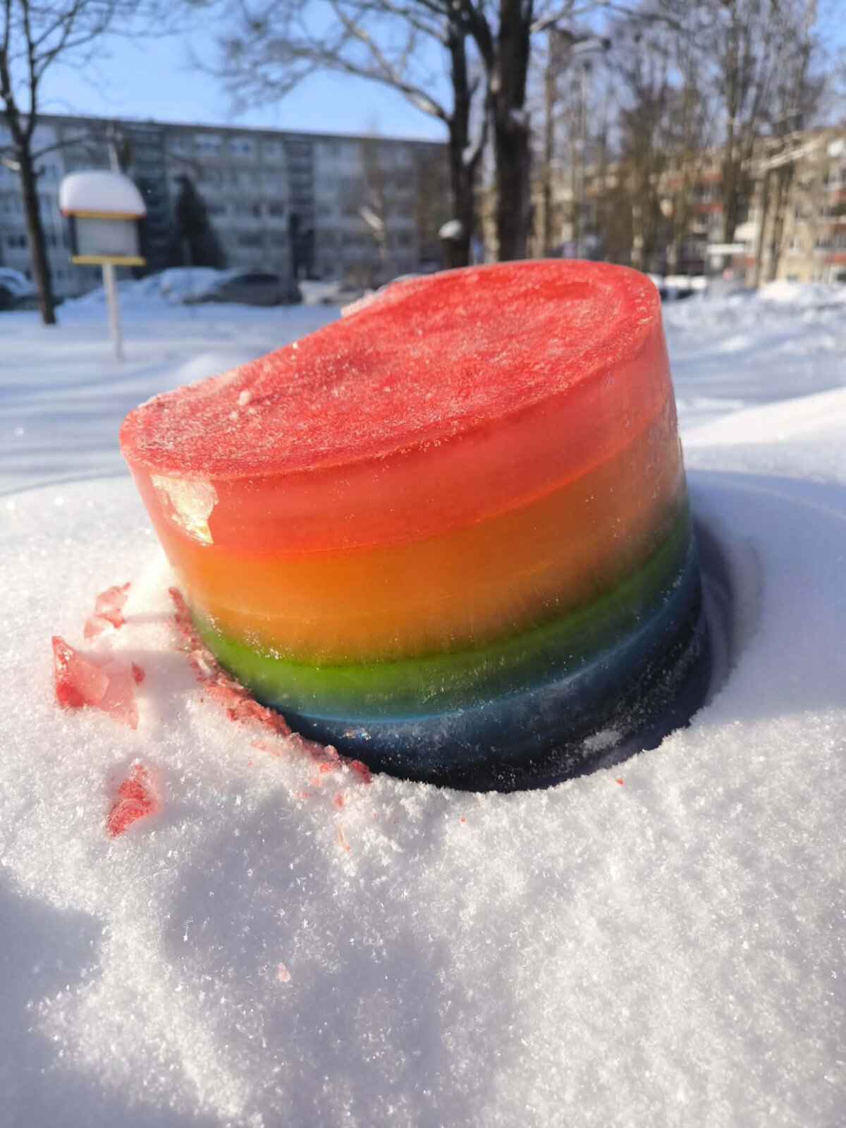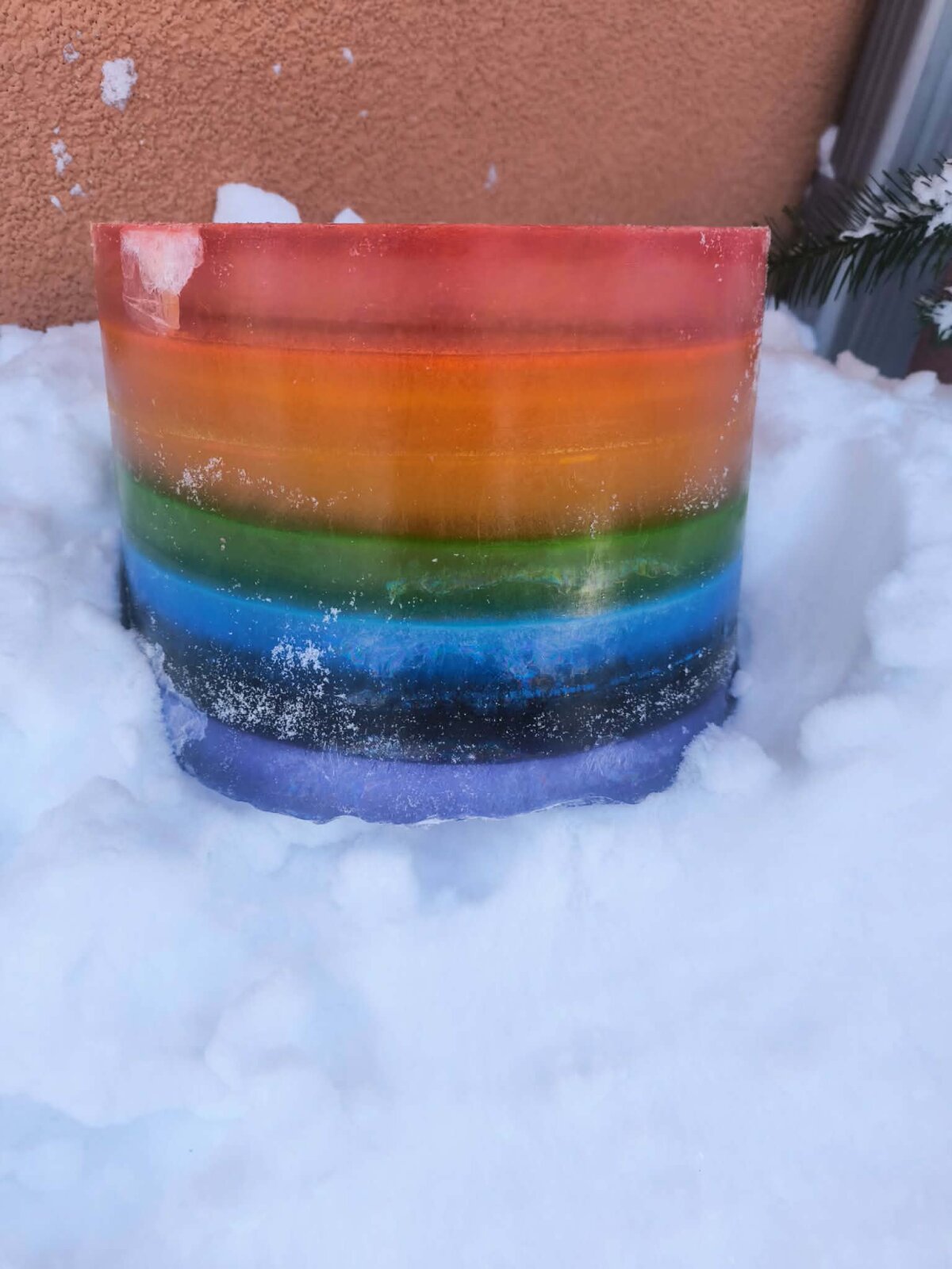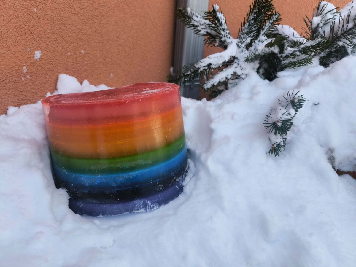 „Pelėdžiukų“ grupės vaikai kartu su mokytoja Reda ir mokinio padėjėja Daiva leidosi į kūrybinį nuotykį – dalyvavo projekte „Ledo dekoracija“. Visi drauge sugalvojo sukurti spalvingą vaivorykštę iš ledo. Visą savaitę vaikai maišė spalvas, pylė vandenį į kibirėlius ir nekantriai stebėjo, kaip lauke vanduo virsta ledu. Reikėjo daug kantrybės, tačiau vieną šaltą žiemos dieną vaikus pradžiugino nuostabus rezultatas – ledinė vaivorykštė! Procesas vaikams labai patiko: jie kasdien smalsiai stebėjo šaldymo stebuklą ir su džiaugsmu laukė galutinio rezultato.“