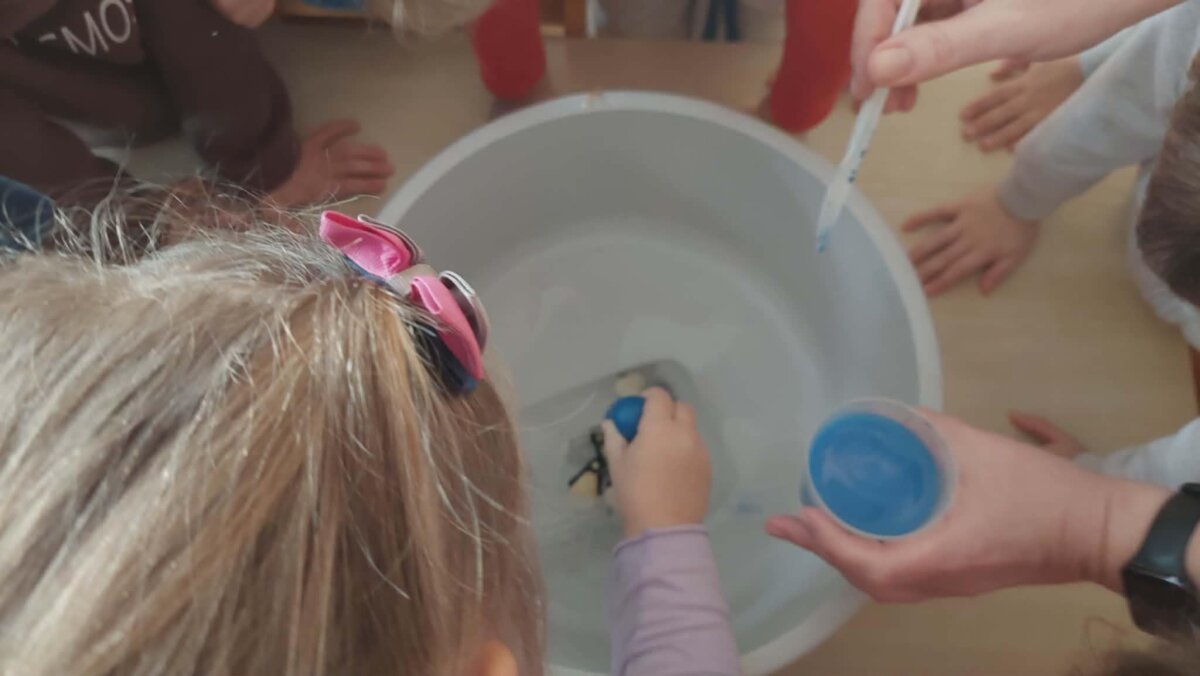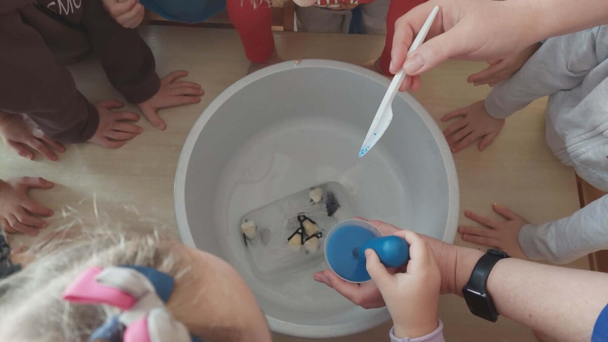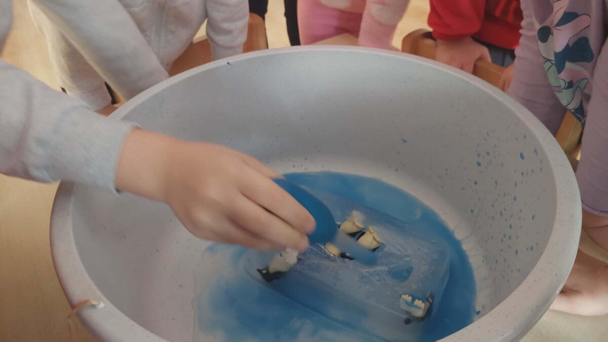 Sausio 19 d. “Pelėdžiukai” grupės ugdytiniai su mokytoja Sandra ir mokinio padėjėja Daiva tyrinėjo ledą ir jo savybes. Jie kartu atliko STEAM veiklą, kuri buvo žaisminga ir kupina atradimų, paverčianti grupę maža poliarine tyrinėjimų erdve. Vaikai liesdami ledą aiškinosi, ką reiškia šalta, o stebėdami ir liesdami mėlynai nudažytą šiltą vandenį suprato, ką reiškia šiluma. Didžiausią džiaugsmą sukėlė lauke užšaldyti žaisliniai pingvinai, kuriuos vaikai grupėje išlaisvino lašindami šiltą mėlyną vandenį pipetėmis. Stebėdami, kaip tirpsta ledas ir atsiranda pingvinai, vaikai patyrė daug emocijų, džiaugėsi sėkme ir jautėsi tikrais tyrėjais. Veiklos metu vaikai skaičiavo pingvinus, įvardino bei skiemenavi žodį “PINGVINAS”, pasakė spalvas ir aktyviai diskutavo apie tai, ką mato ir jaučia. Vėliau jie tęsė veiklą spalvindami pingvinus užduotėlėje, įtvirtindami patirtus įspūdžius ir mokymąsi per patyrimą.