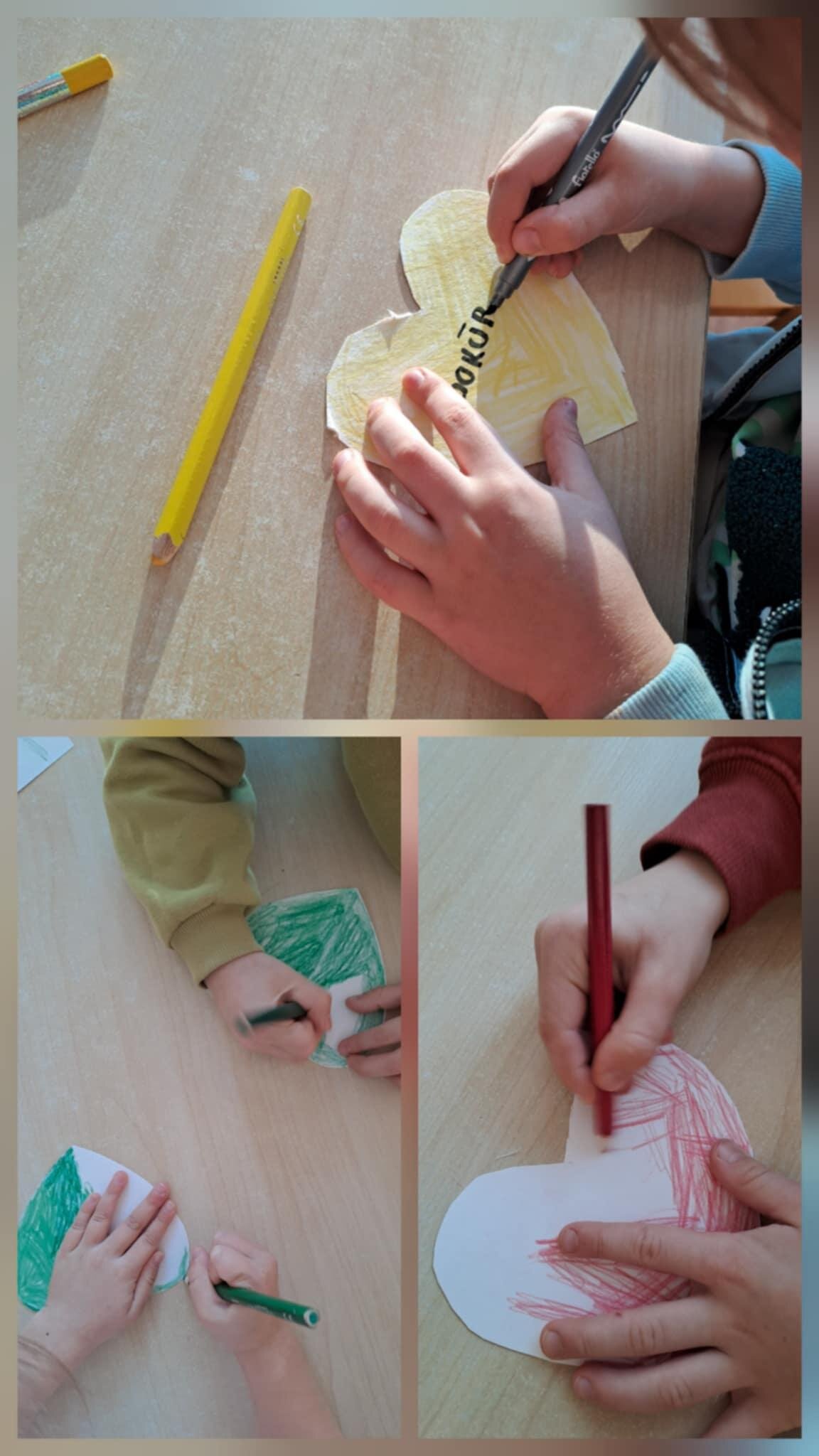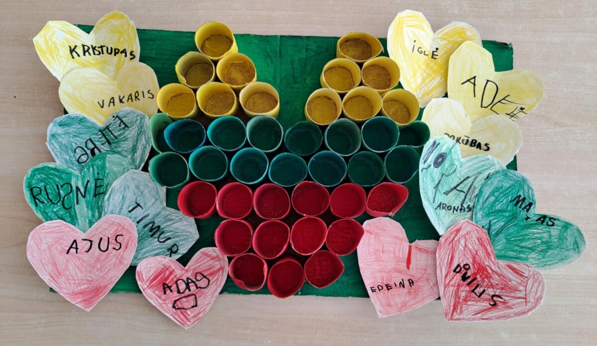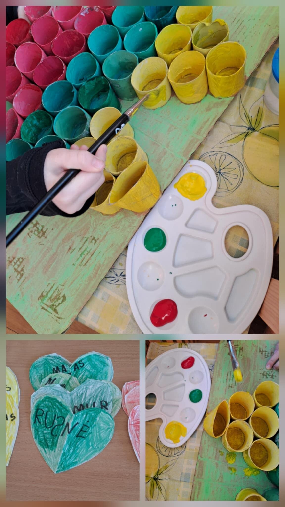 Artėjant Vasario 16-ajai, 2026 m. vasario 4 d. grupės “Pelėdžiukai” vaikai ir mokytoja Eglė dalyvavo STEAM kūrybinėje veikloje, kurioje buvo integruotas menas, inžinerinis mąstymas ir tvarumo idėjos. Veiklos metu buvo naudojamos antrinės žaliavos– dėžė ir tualetinio popieriaus ritinėliai, taip pat guašas, teptukai, žirklės, juodas flomasteris, spalvoti pieštukai ir baltas popierius. Vaikai karpė popieriaus ritinėlius, juos spalvino guašu, iš balto popieriaus kirpo širdeles, kurias nuspalvino Lietuvos trispalvės spalvomis, užrašė savo vardus. Mokytoja, naudodama karštus klijus, padėjo sujungti darbą į visumą. Veiklos metu vaikai tyrinėjo, kaip iš antrinių žaliavų galima sukurti naujus objektus, lavino smulkiąją motoriką, kūrybiškumą. Visi džiaugėsi gautu rezultatu ir savo sukurtą didelę širdį dovanojo artėjančios šventės proga.