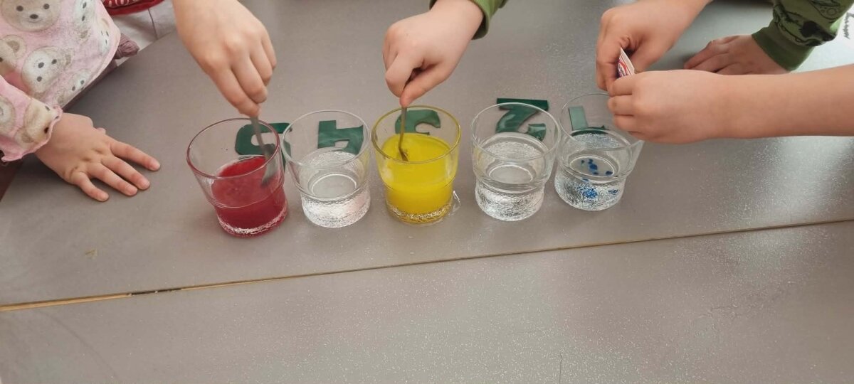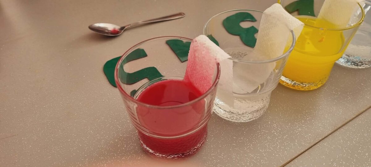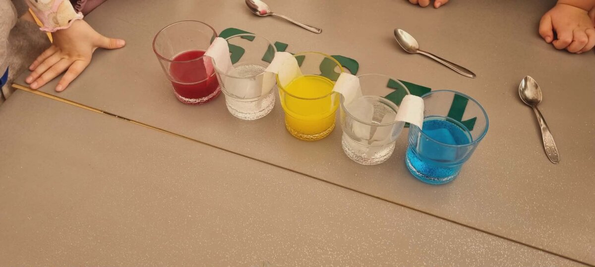 Eksperimento metu ant stalo buvo išrikiuotos penkios stiklinės su vandeniu. Į pirmąją, trečiąją ir penktąją vaikai įlašino maistinių dažų – raudonos, geltonos ir mėlynos spalvų. Tuomet stiklines sujungė popierinio rankšluosčio juostelėmis ir su nekantrumu pradėjo stebėti, kas nutiks.