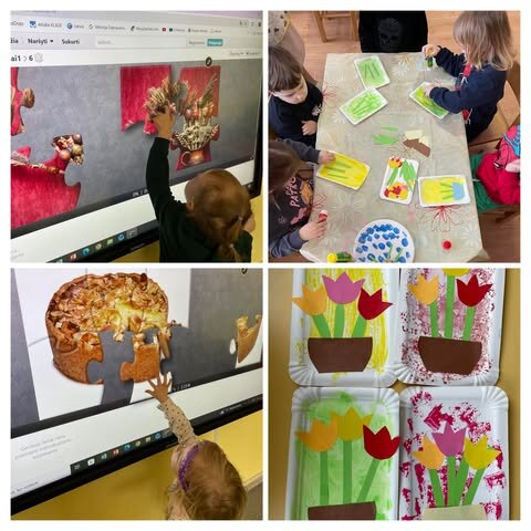 Per įvairias kūrybines veiklas vaikai patys išbandė skirtingus amatus. Jie lipdė dirbinius iš molio ir druskos tešlos, kūrė apyrankes, karoliukus, gamino riestainius iš modelino, karpė, klijavo, audė siūlus ant kartoninių „staklių“, kūrė verbas iš augalų šakelių ir gėlių. Dirbdami mažose grupelėse vaikai mokėsi bendradarbiauti, dalintis priemonėmis, kantriai atlikti užduotis ir džiaugtis kūrybos procesu.