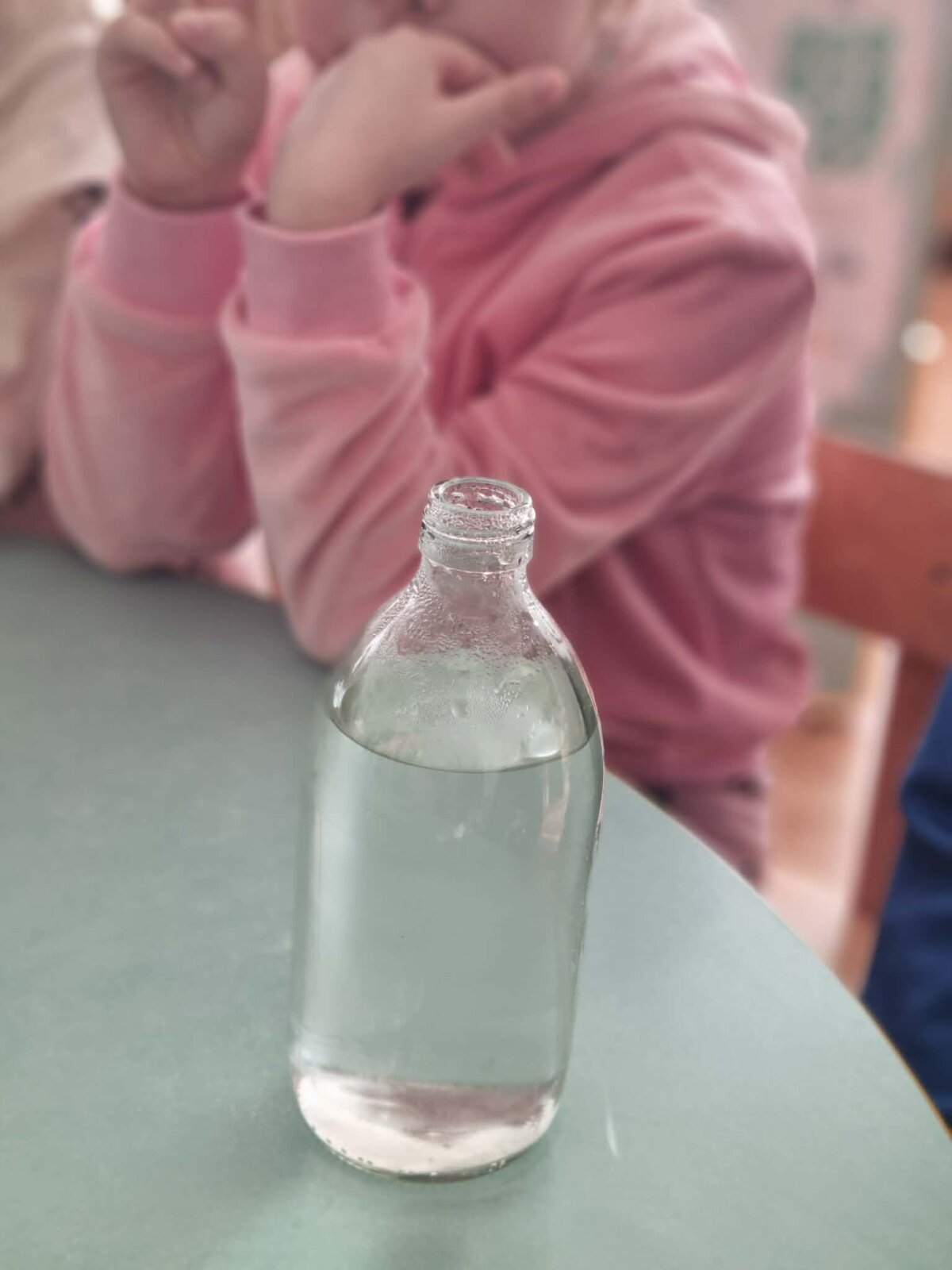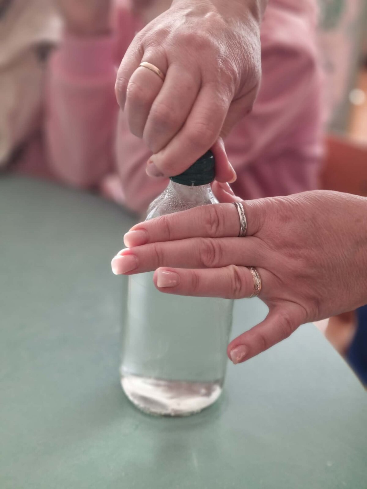 Veiklos eiga: į plastikinį butelį įpylėme nedidelį kiekį šilto vandens, kad apsemtų dugną. Butelį sandariai užsukome ir stipriai suspaudėme rankomis, palaikėme keletą sekundžių, o tuomet staiga atleidome. Atleidus butelį, jo viduje pasirodė rūkas – mažytis „debesėlis“.