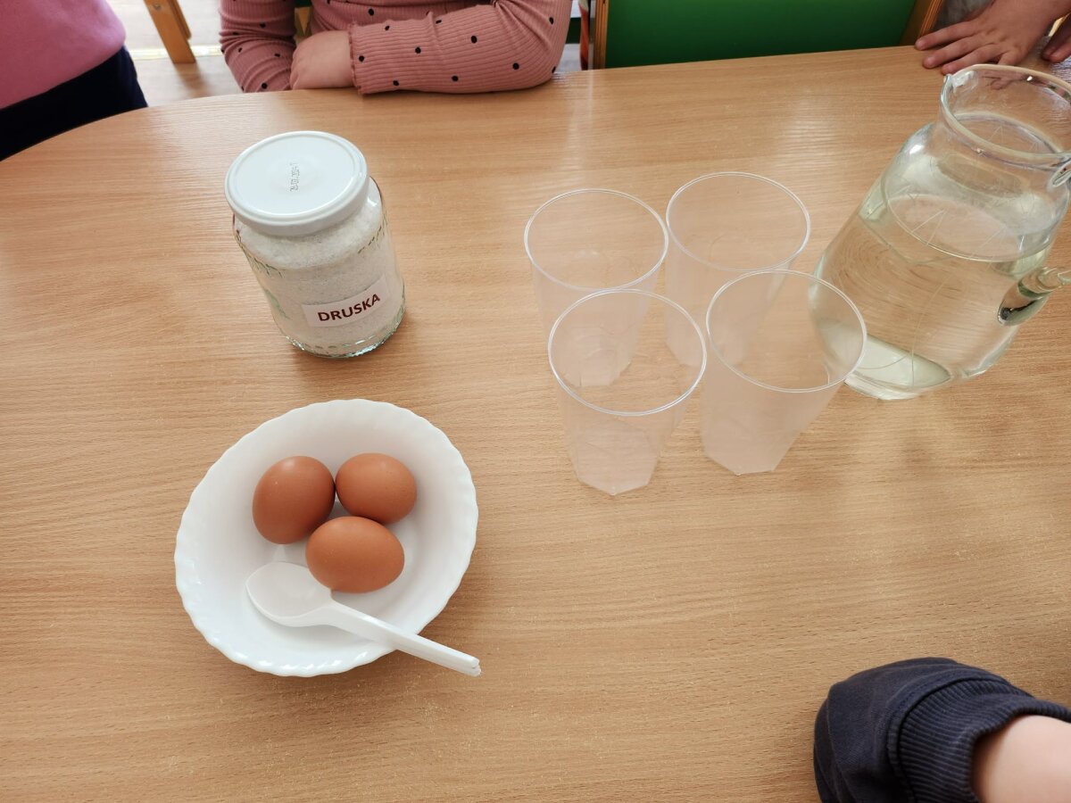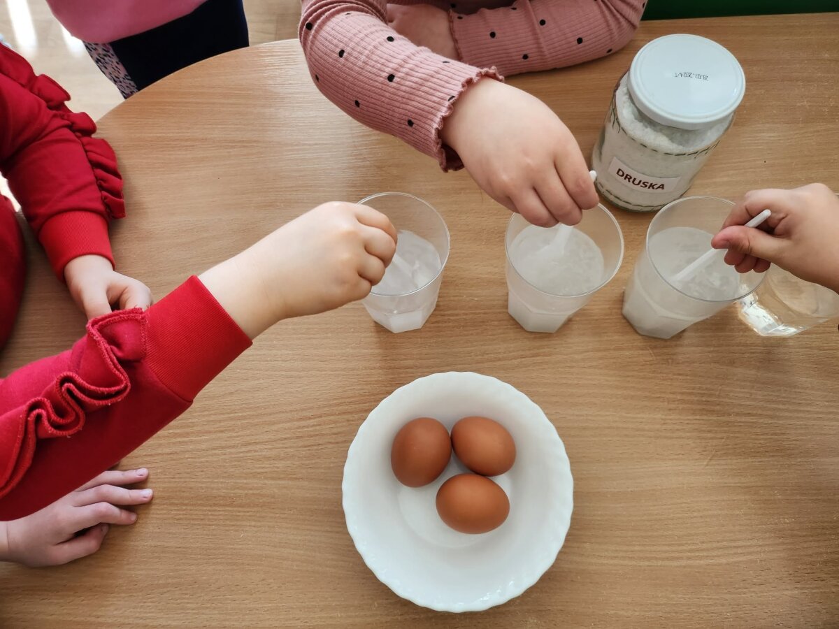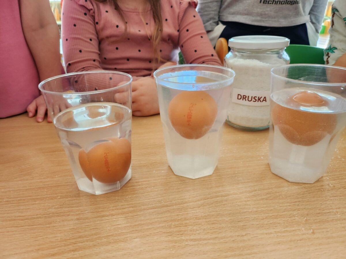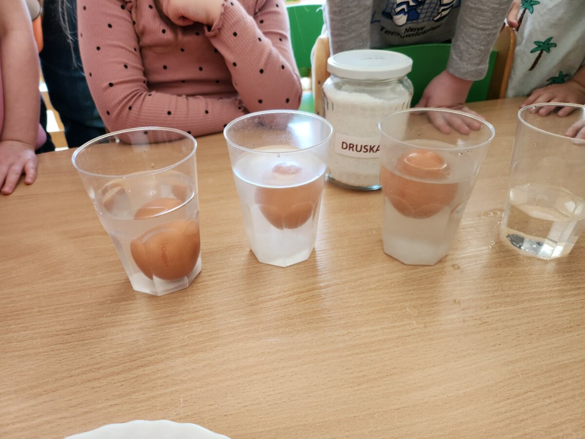 Į pirmą stiklinę įdėtas kiaušinis nuskendo, į antrą - plūduriavo, o į trečią įdėtas – iškilo į paviršių. Vaikai stebėjo, lygino ir aptarė, kodėl taip atsitiko. Eksperimento metu jie sužinojo, kad druska pakeičia vandens tankį – sūrus vanduo tampa „stipresnis“ ir gali išlaikyti kiaušinį paviršiuje. Panašiai žmogui lengviau išsilaikyti ant vandens jūroje nei ežere.