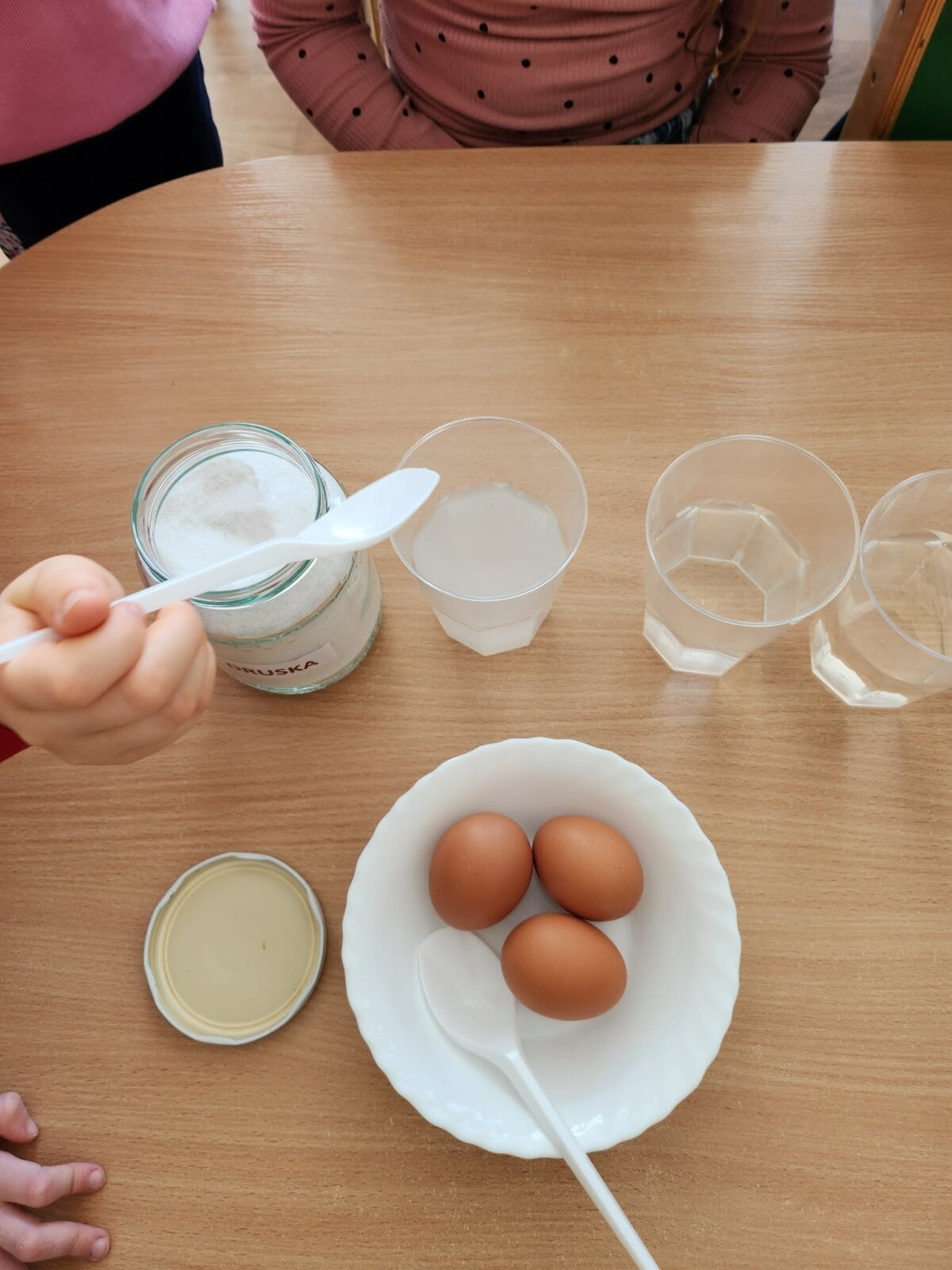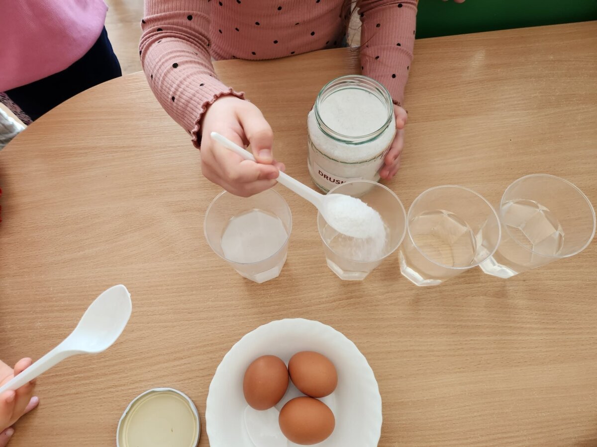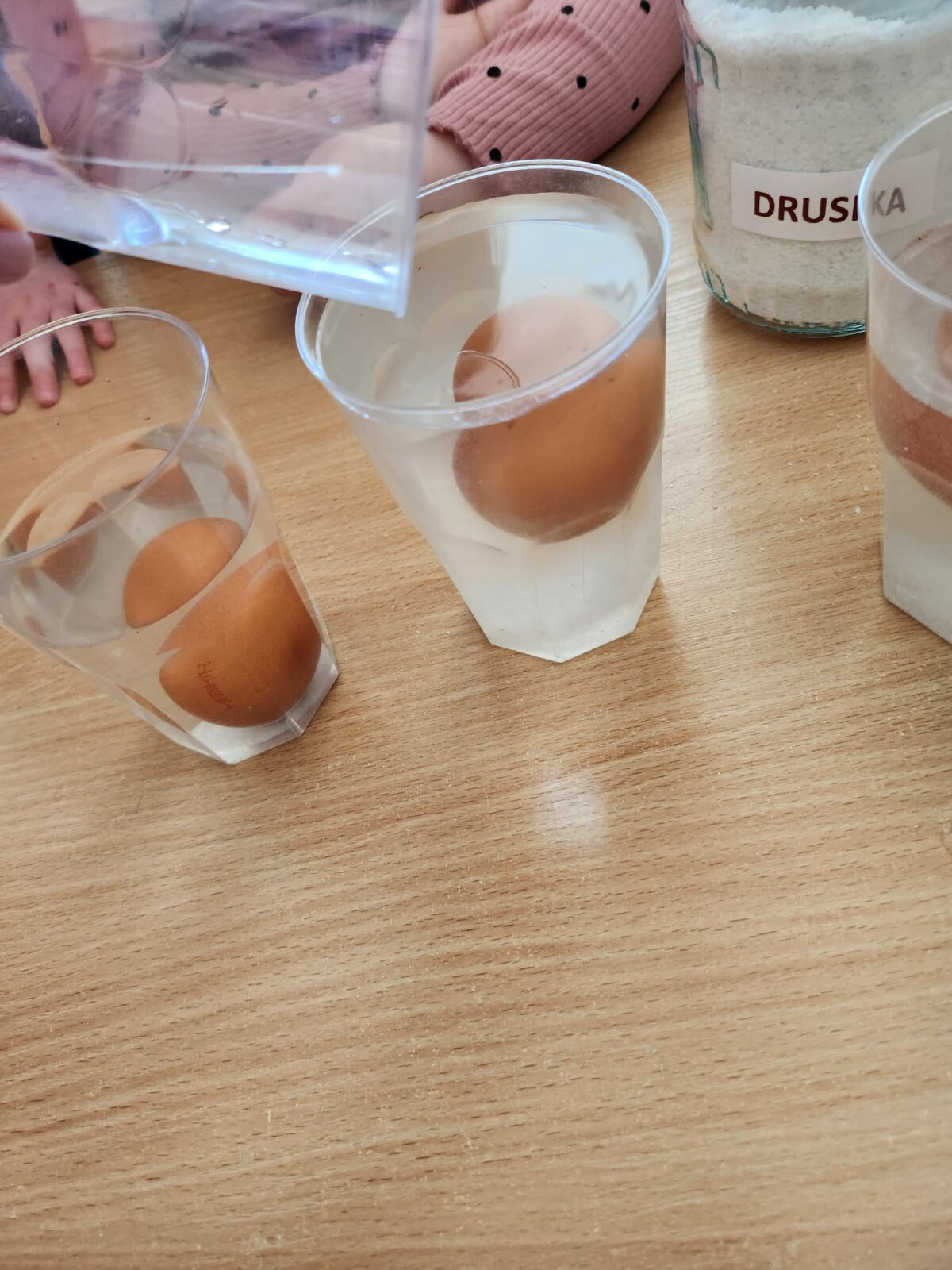 Į pirmą stiklinę įdėtas kiaušinis nuskendo, į antrą - plūduriavo, o į trečią įdėtas – iškilo į paviršių. Vaikai stebėjo, lygino ir aptarė, kodėl taip atsitiko. Eksperimento metu jie sužinojo, kad druska pakeičia vandens tankį – sūrus vanduo tampa „stipresnis“ ir gali išlaikyti kiaušinį paviršiuje. Panašiai žmogui lengviau išsilaikyti ant vandens jūroje nei ežere.