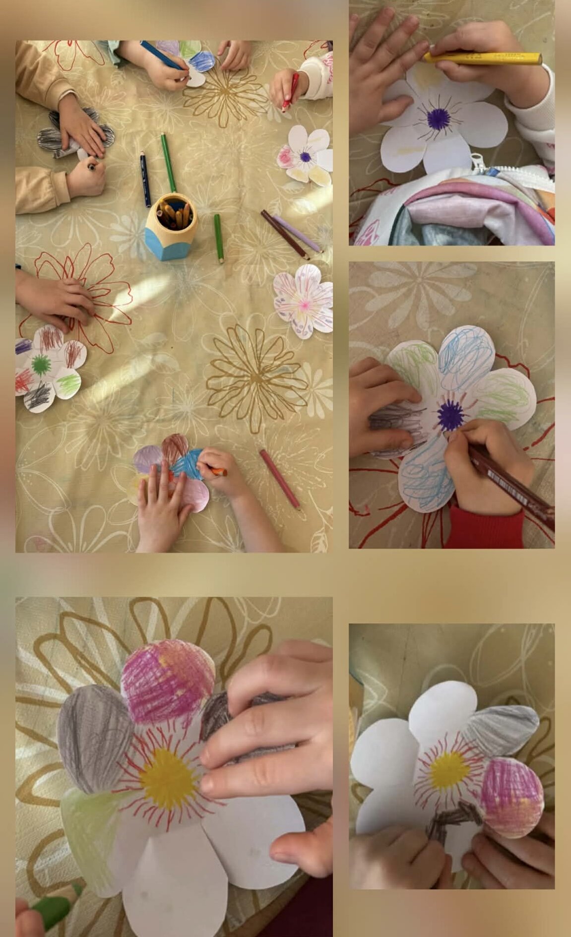 Spalvino popierines gėles, rinkdamiesi įvairias spalvas ir derinius, taip lavindami smulkiąją motoriką bei kūrybiškumą.