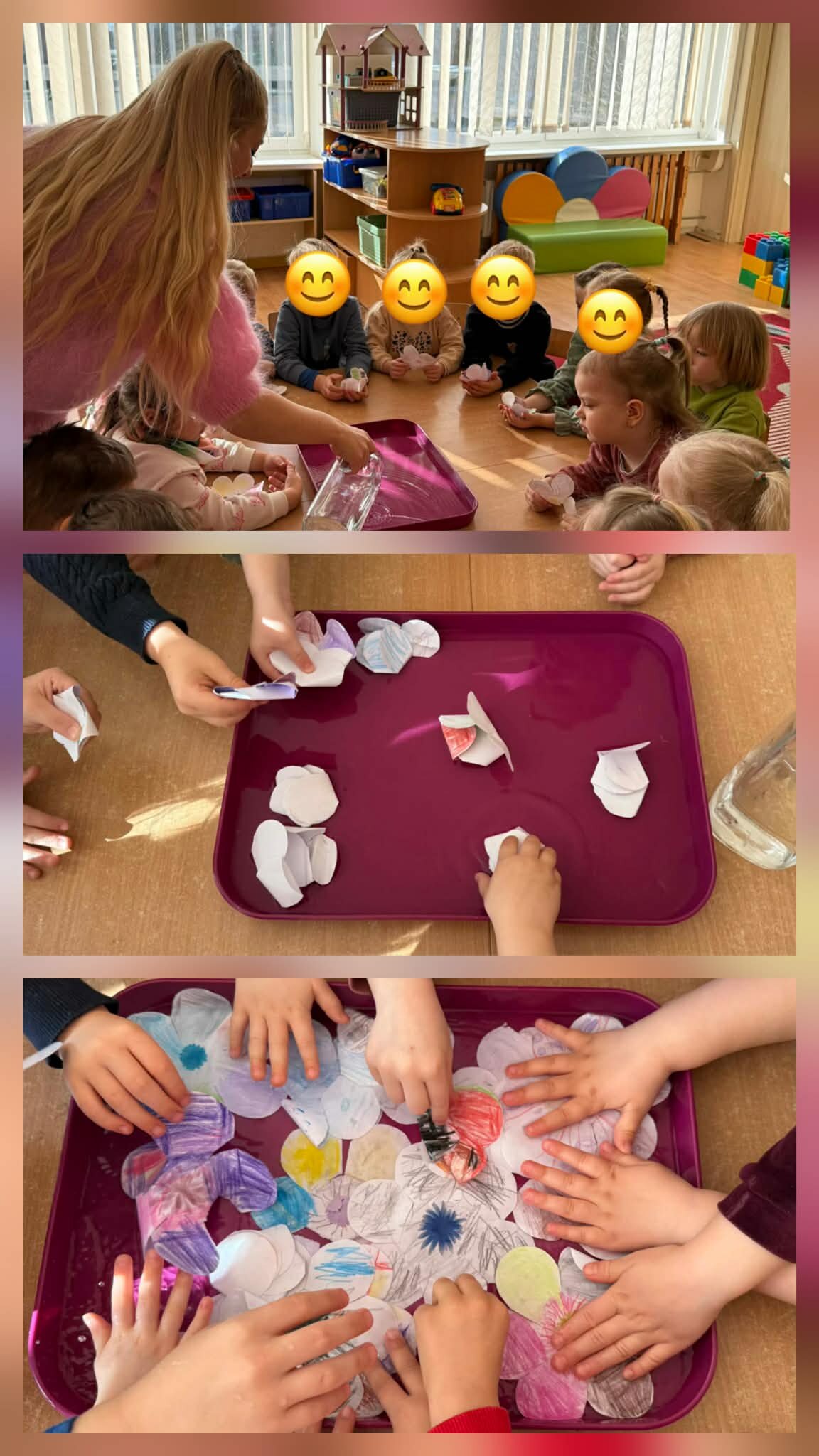 Vėliau jie dėjo savo nuspalvintas gėles į padėklą su vandeniu ir stebėjo, kaip gėlės pamažu „pražysta“ – skleidžiasi jų žiedlapiai.