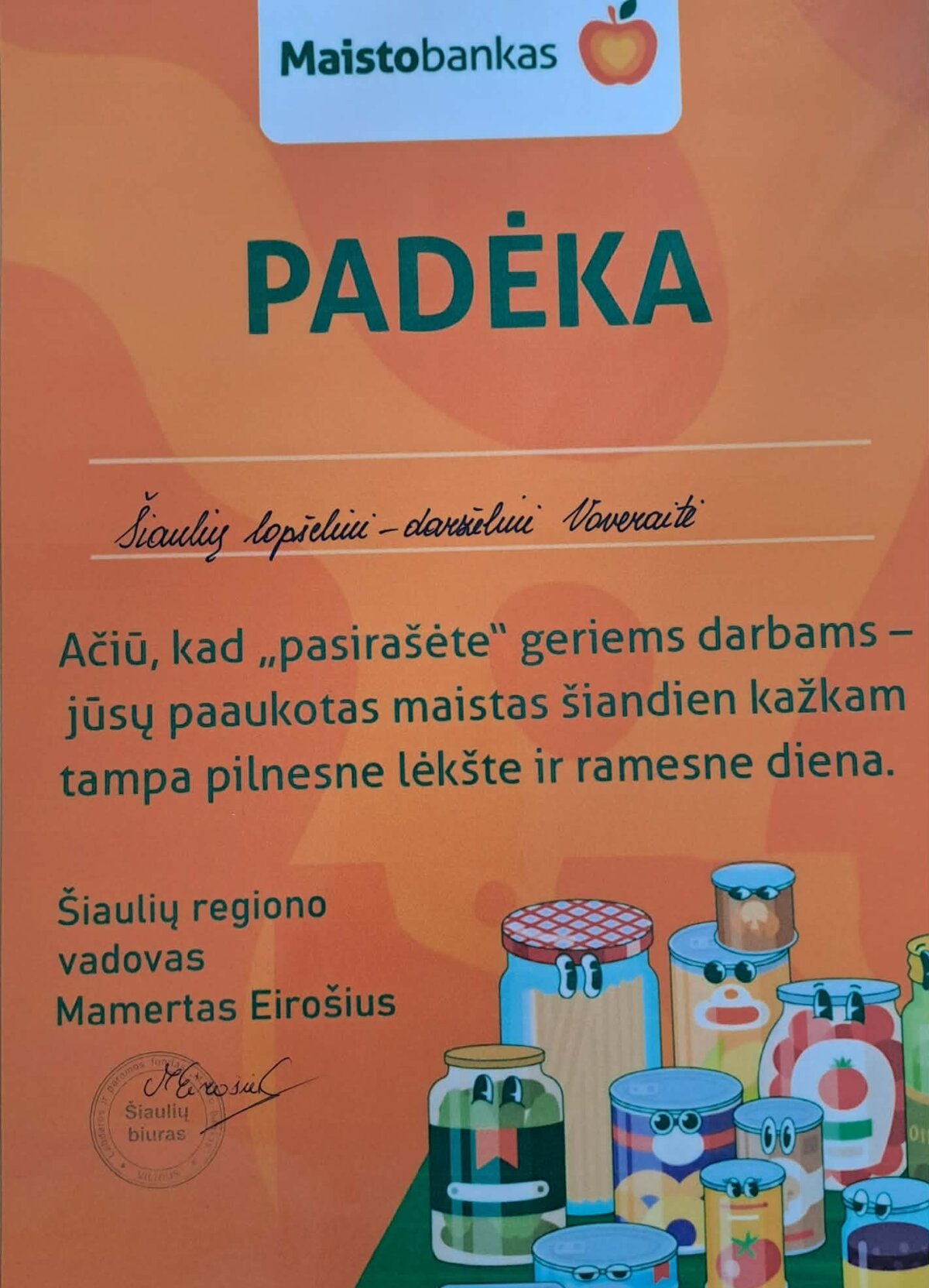 2026 m. kovo 16-27 d. lopšelio-darželio „Voveraitė“ bendruomenė aktyviai dalyvavo gerumo akcijoje „Maisto bankas“. Vaikai, tėveliai ir darbuotojai aukojo įvairius produktus stokojantiems žmonėms. Viską, kas buvo surinkta, mokytoja Eglė ir socialinė pedagogė Severija pristatė į Šiaulių “Maisto banko” skyrių. Kartu vyko darželio ugdytiniai Goda ir Jokūbas su mama Reda. Apsilankymo metu vaikai turėjo galimybę sužinoti, kaip vyksta maisto surinkimas, rūšiavimas ir paskirstymas, kaip produktai pasiekia tuos, kuriems labiausiai reikia pagalbos. Tai buvo prasminga ir vertinga patirtis, skatinanti suprasti dalijimosi ir pagalbos svarbą. Džiaugiamės galėję prisidėti prie šios iniciatyvos ir dar kartą įsitikinome – daryti gerus darbus yra nuostabu. Nuoširdžiai dėkojame visiems prisidėjusiems! Pasidžiaukime gauta padėka, kuri primins, kad geriems darbams nėra grafiko, pasaulis jų laukia kasdien…